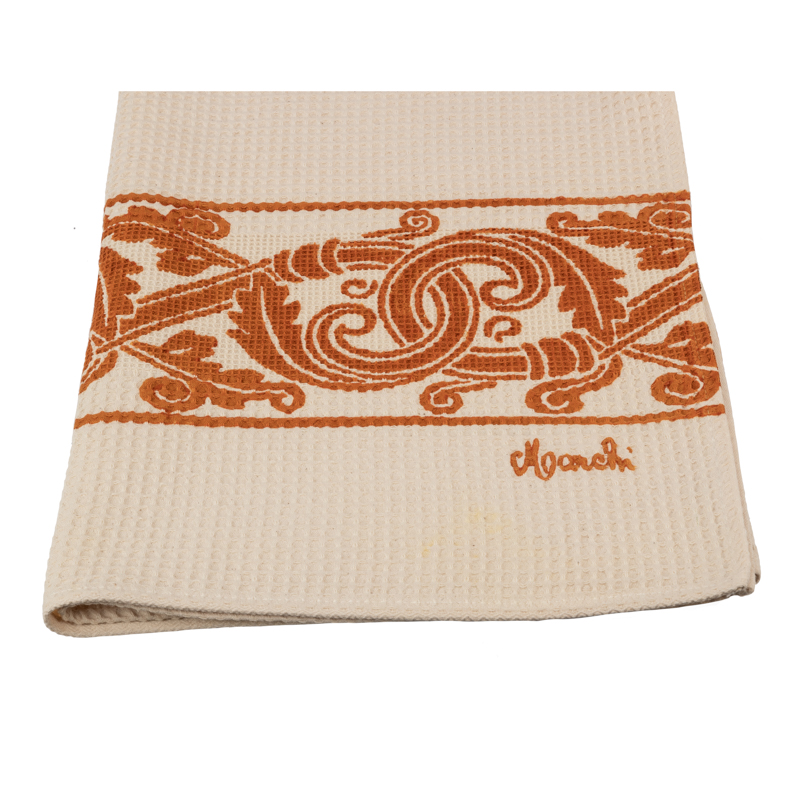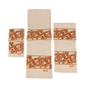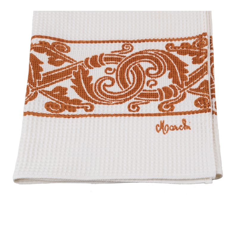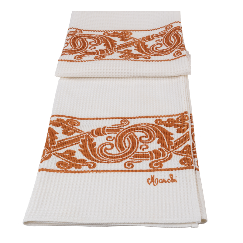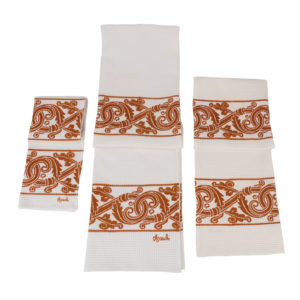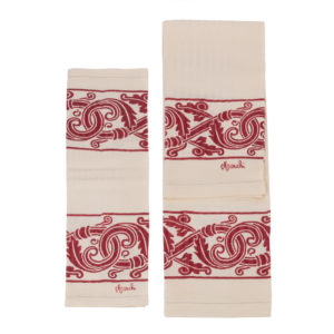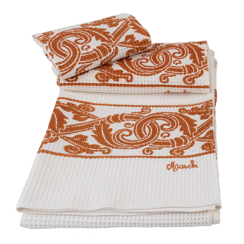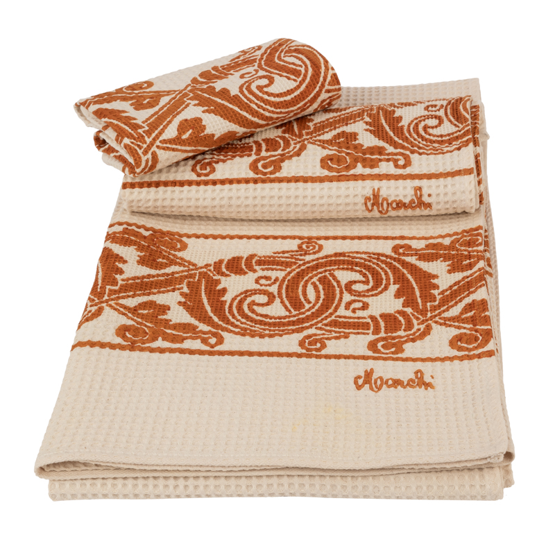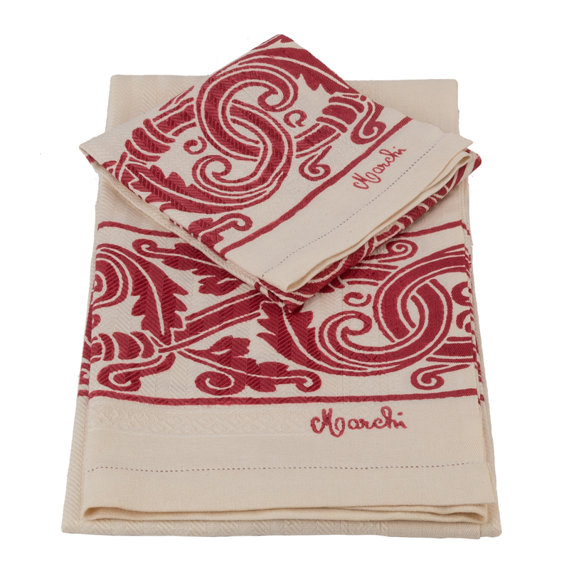 Set Asciugamano viso e ospite realizzati realizzati con tessuto di alta qualitร stirato con il nostro antico mangano del 1633 e sapientemente stampato a mano con il disegno del Nodo d’amore dei Malatesta.