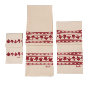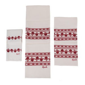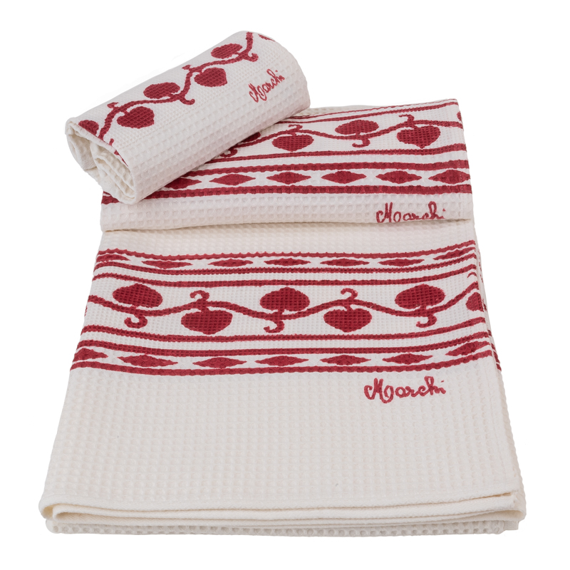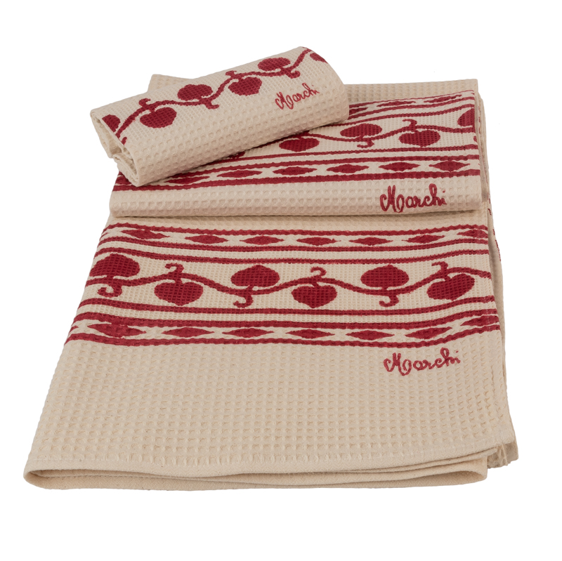 Set Asciugamano viso e ospite realizzati realizzati con tessuto di alta qualitร  stirato con il nostro antico mangano del 1633 e sapientemente stampato a mano con l’antico disegno ornamentale risalente al 1700