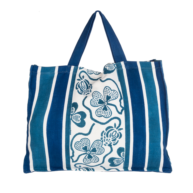 Borsa Mare con fiori 56x43x9 cm realizzata in tela antica tessuta a telaio con fiori stampati e dipinta a mano da Lara Marchi e internamente foderata con pregiato tessuto di puro cotone jacquard color bianco.