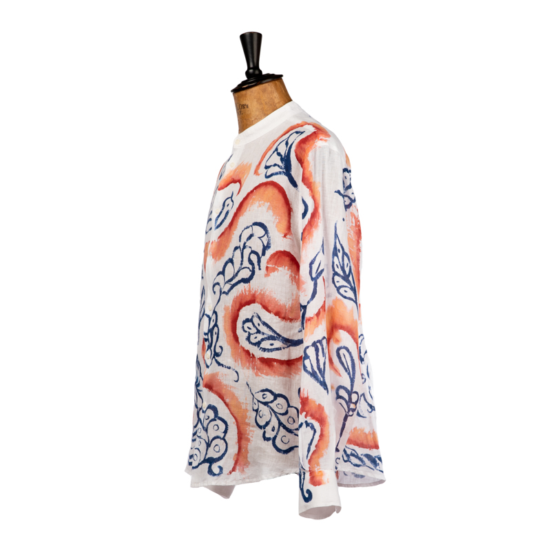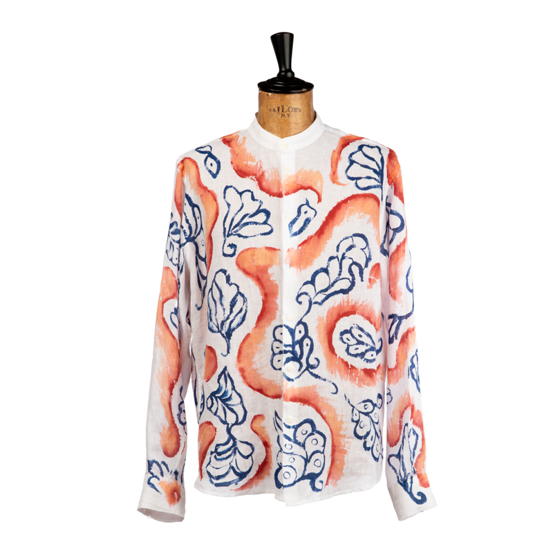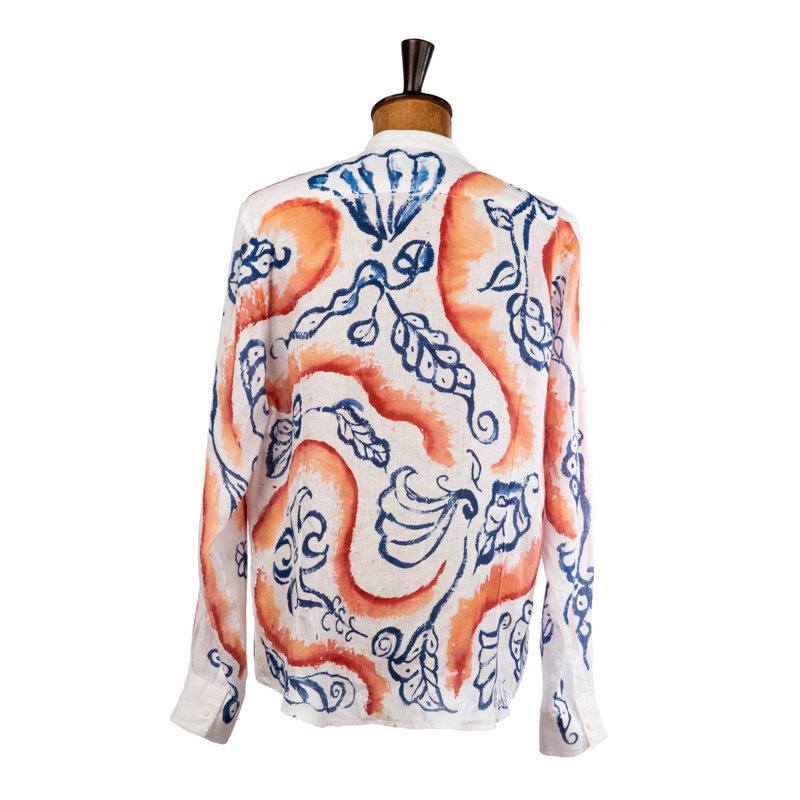 Camicia in puro lino dipinta a mano da Massimo Modula utilizzando i colori naturali realizzati in bottega seguendo la stessa ricetta che dal 1633 è stata tramandata segretamente di padre in figlio.