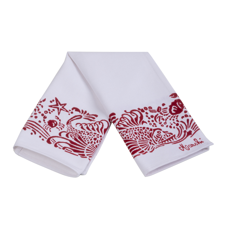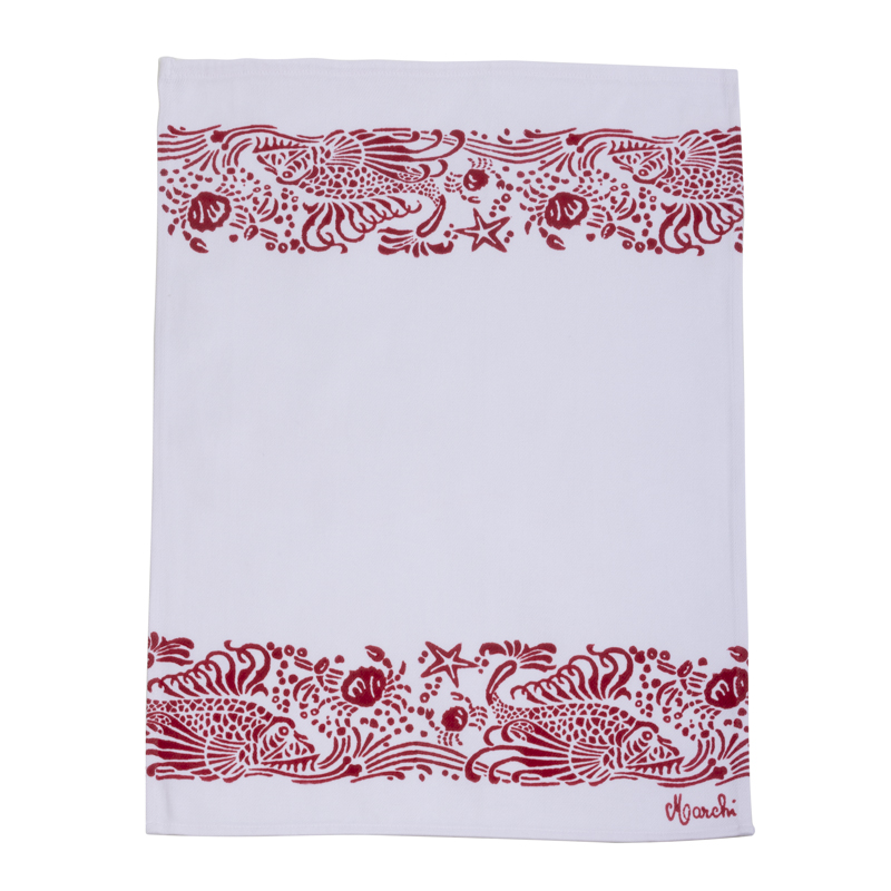 Canovaccio realizzato con tessuto di alta qualitร stirato con il nostro antico mangano del 1633 e sapientemente stampato a mano con il disegno de fondale marino.