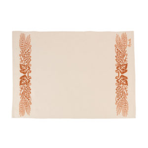 Canovaccio realizzato con tessuto stirato con il nostro antico mangano del 1633 e sapientemente stampato a mano con il disegno della spiga e dell’uva