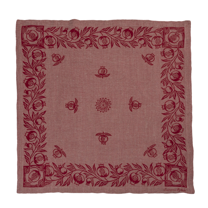 Centro tavola realizzato con puro lino nattè stirato con il nostro antico mangano del 1633 e sapientemente stampato a mano con il disegno del melograno con sparso e fiore stilizzato centrale.