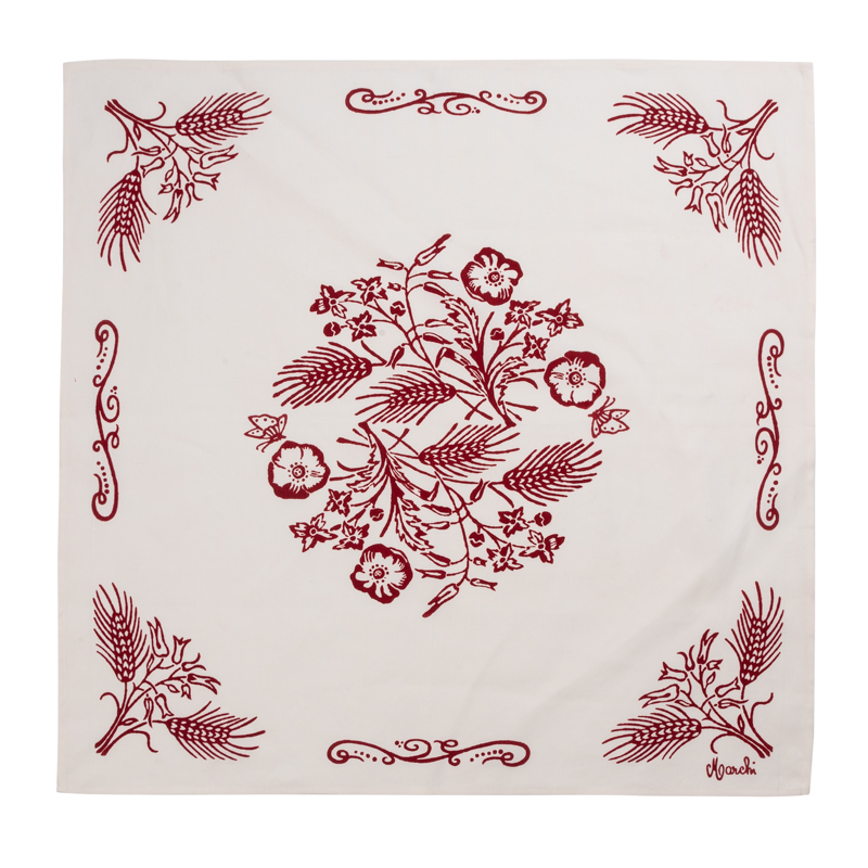Centro tavola realizzato con tessuto stirato con il nostro antico mangano del 1633 e sapientemente stampato a mano con il disegno dei papaveri e spighe