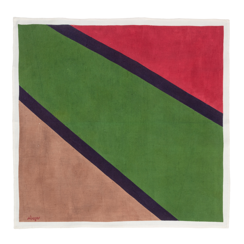 Centro tavola 85×85 cm in puro lino dipinto a mano da Lara Marchi. Pezzo unico.
