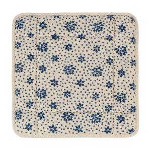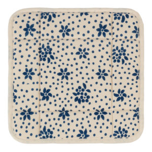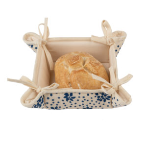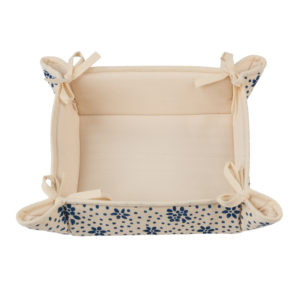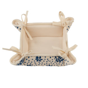 Cestino per il pane con tessuto di alta qualitร stirato con il nostro antico mangano del 1633 con imbottitura interna e con laccetti laterali, sapientemente stampato a mano con il disegno del fiore stilizzato, stampa a fondo pieno.