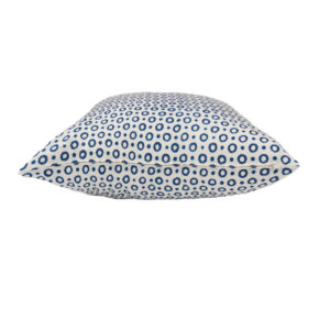 Cuscino con imbottitura interna in lana sintetica realizzato con fodera in tessuto di alta qualitร  stirato con il nostro antico mangano del 1633 e sapientemente stampato a mano con il disegno dei cerchi e pois.
