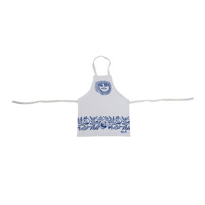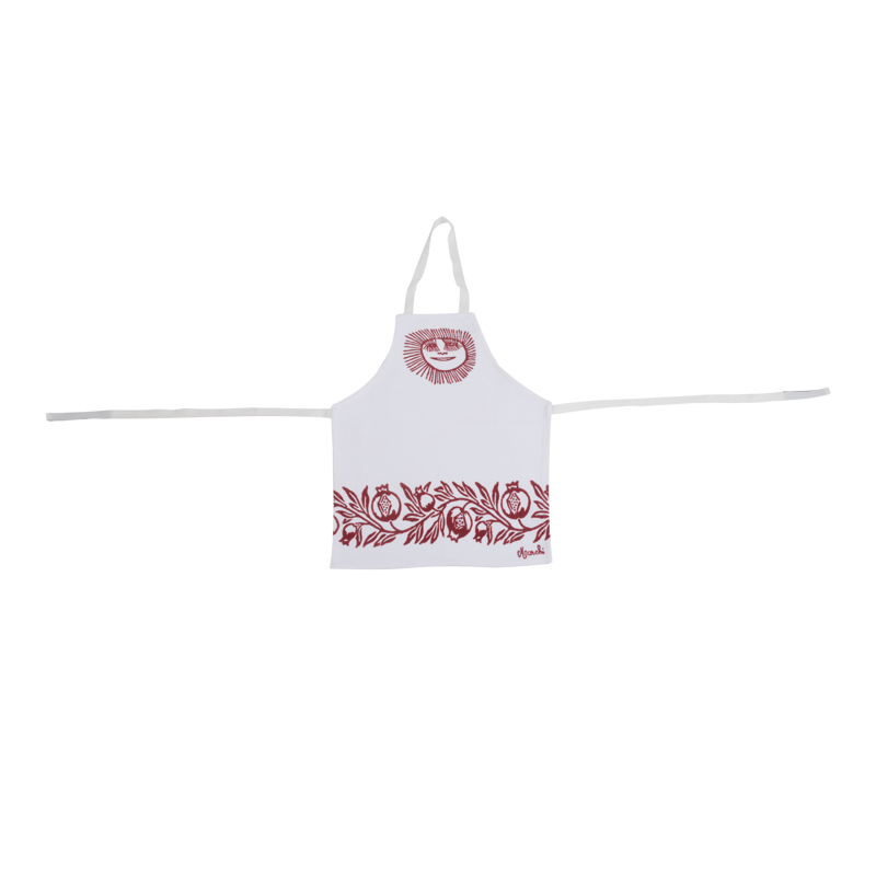 Grembiule baby H50xL38 con pettorina senza tasche, sapientemente stampato a mano con il sole di Federico Moroni e bordo Melograno.