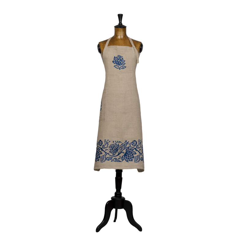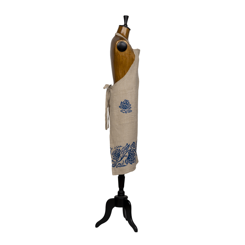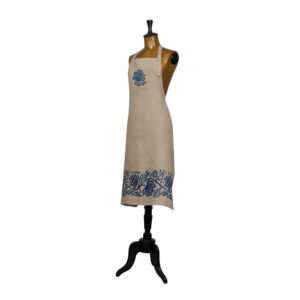 Grembiule in puro lino nattè misura 90x95cm con pettorina e una tasca laterale, sapientemente stampato a mano con il disegno del cardo.