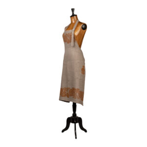 Grembiule in puro lino nattè misura 90x95cm con pettorina e una tasca laterale, sapientemente stampato a mano con il disegno della Pigna.