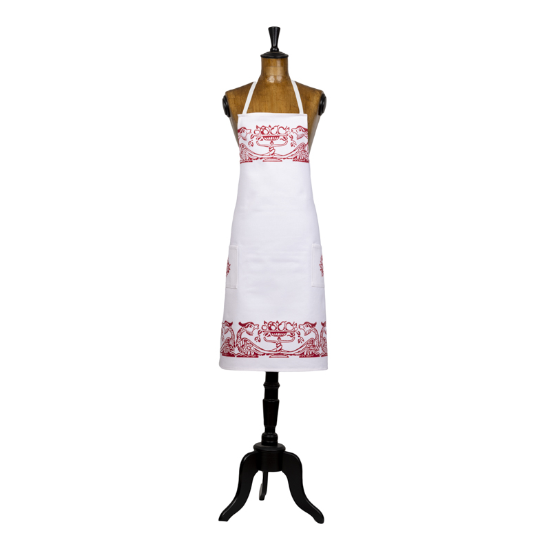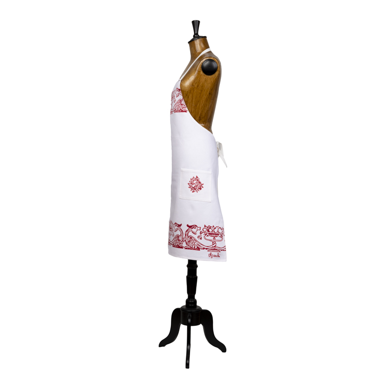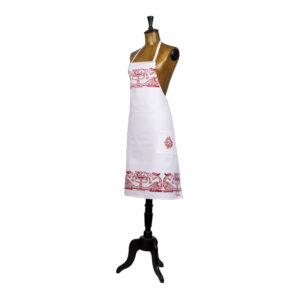 Grembiule con pettorina e due tasche, sapientemente stampato a mano con il disegno liberty dei draghi e frutta.