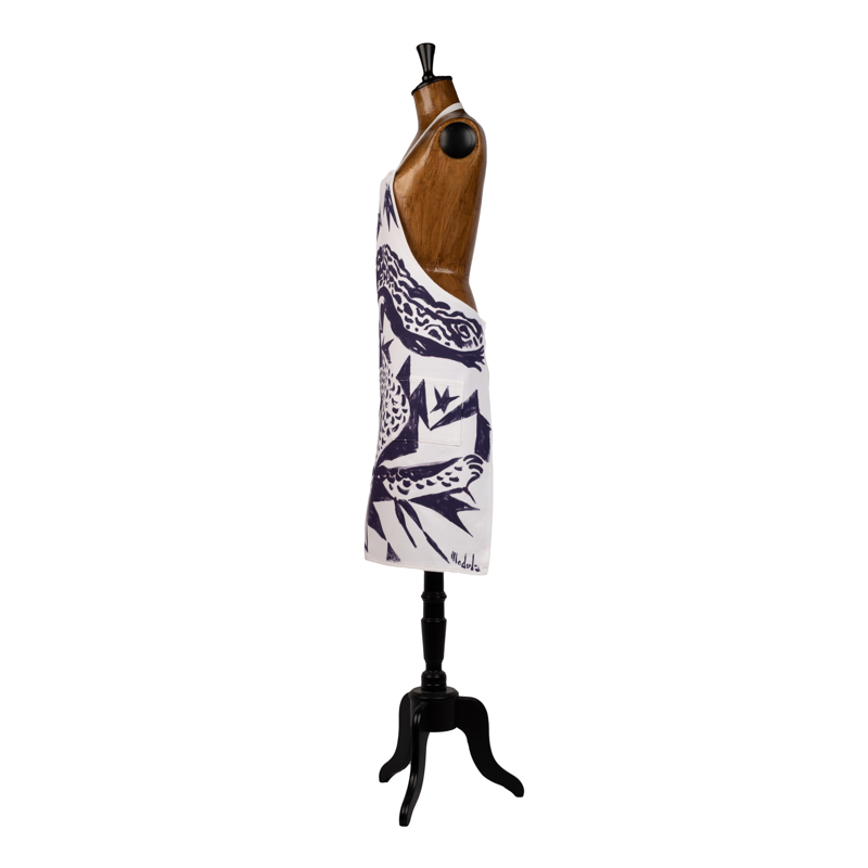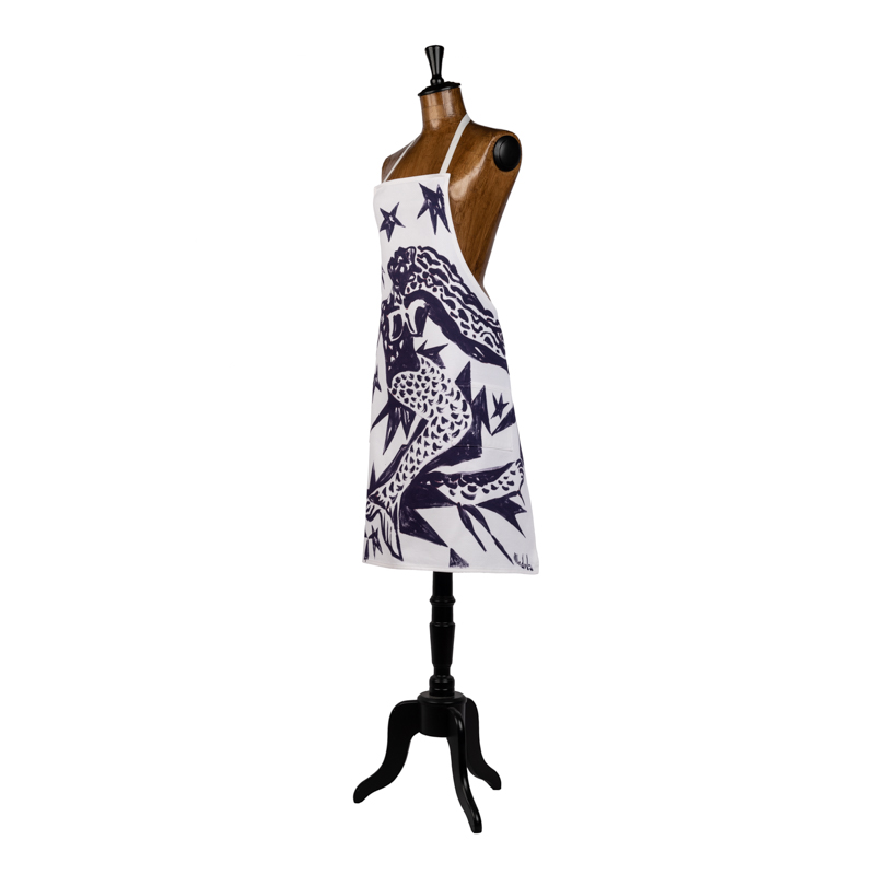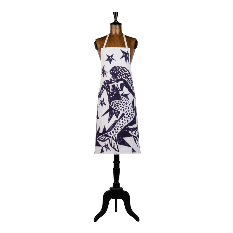 Grembiule con pettorina e tasche in cotone spinato con sirena viola dipinta a mano da Massimo Modula