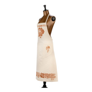Grembiule con pettorina e due tasche sapientemente stampato a mano con il disegno della spiga di grano e il grappolo d’ uva.