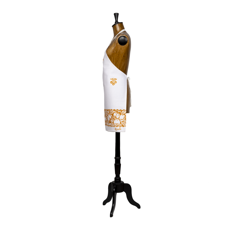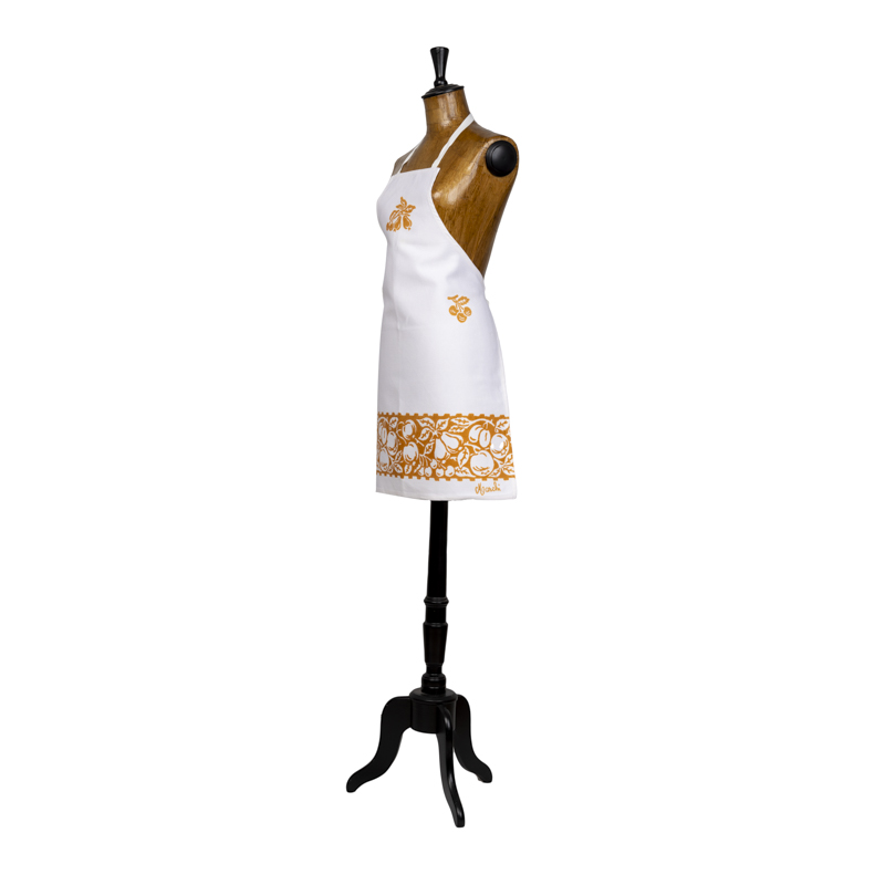 Grembiule medio con pettorina senza tasche, sapientemente stampato a mano con il disegno della frutta in negativo.