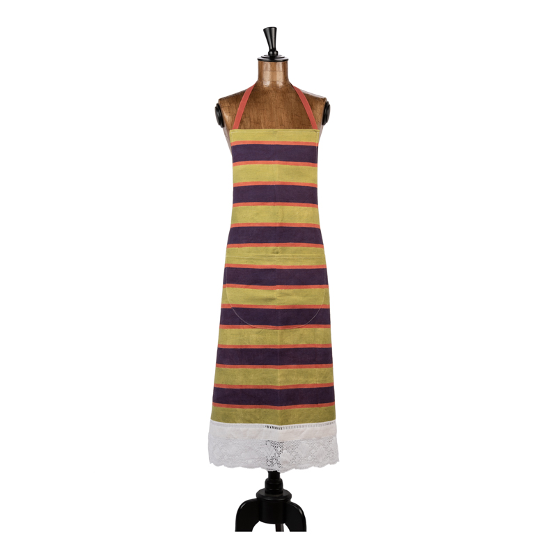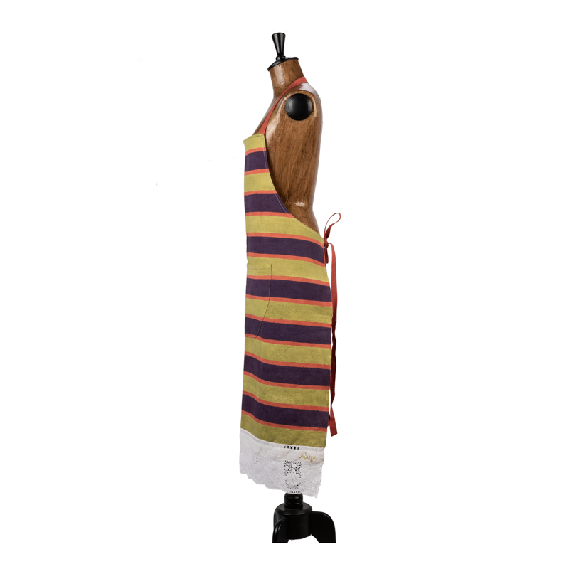 Grembiule in canapa antica tessuta a telaio con gigliuccio fatto a mano e pizzo con pettorina e tasca centrale a righe dipinto a mano da Lara Marchi. Pezzo unico.