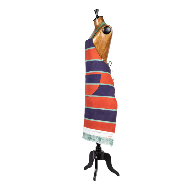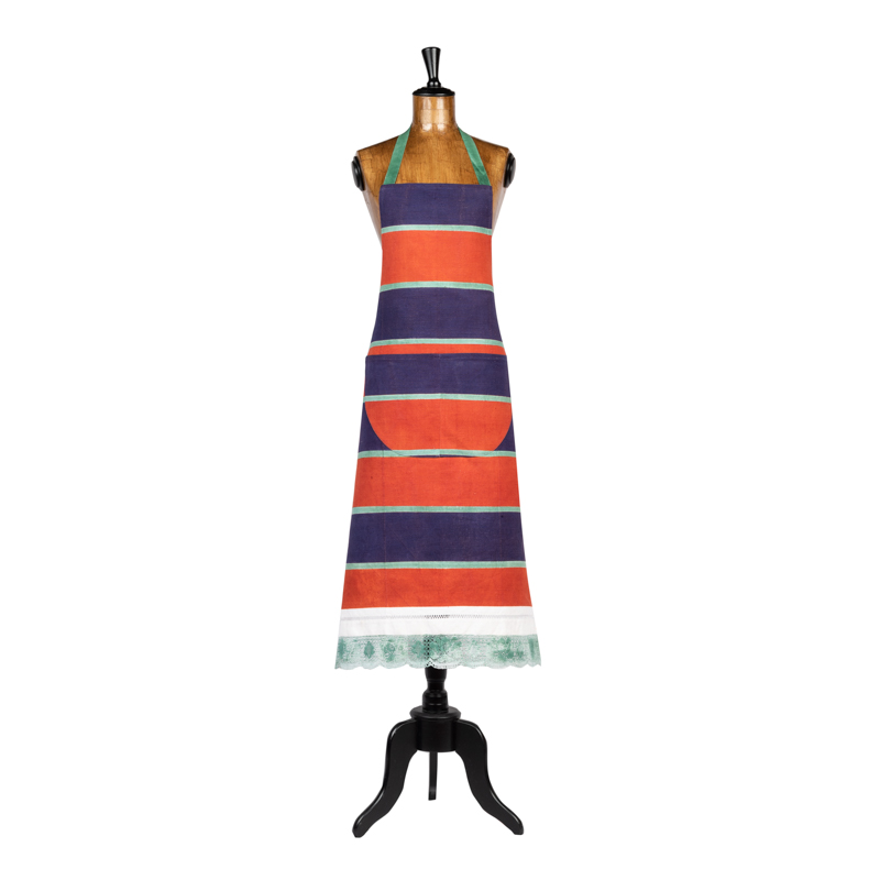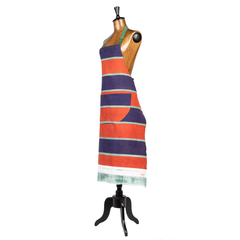Grembiule con pettorina e tasca centrale righe orizzontali arancio e viola. Pezzo unico.