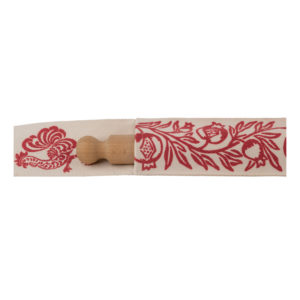 Porta mattarello realizzato con tessuto di alta qualitร stirato con il nostro antico mangano del 1633 e sapientemente stampato a mano con il disegno del melograno.