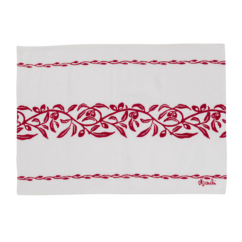 Runner realizzato con tessuto di alta qualitร stirato con il nostro antico mangano del 1633 e sapientemente stampato a mano con il disegno dell’Ulivo.