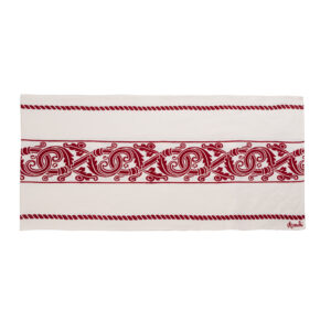 Elegante Runner realizzato con tessuto di alta qualitร stirato con il nostro antico mangano del 1633 e sapientemente stampato a mano con il disegno del nodo d’amore dei Malatesta.