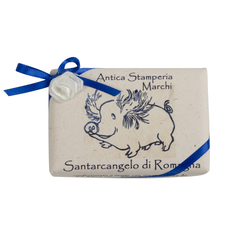 Saponetta con il Maialino disegnato da Federico Moroni, realizzata secondo l’antica tradizione manifatturiera, con materie prime di origine vegetale finemente profumati in trafila, solo con fragranze accuratamente selezionate.