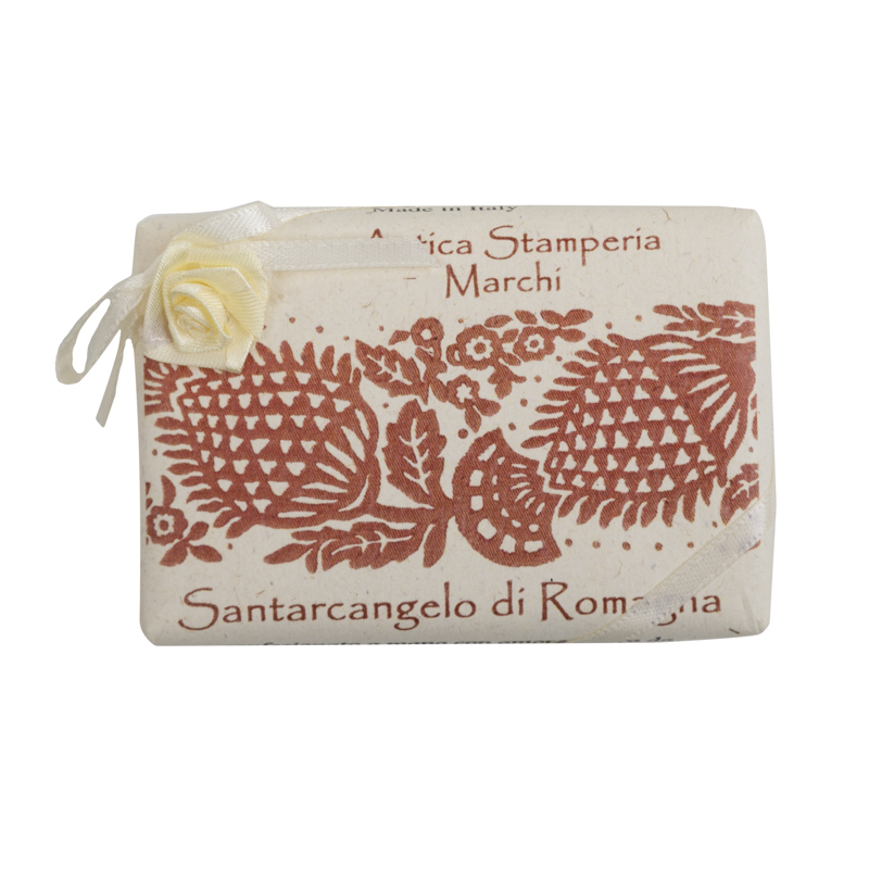 Saponetta con la Pigna, realizzata secondo l’antica tradizione manifatturiera, con materie prime di origine vegetale finemente profumati in trafila, solo con fragranze accuratamente selezionate.