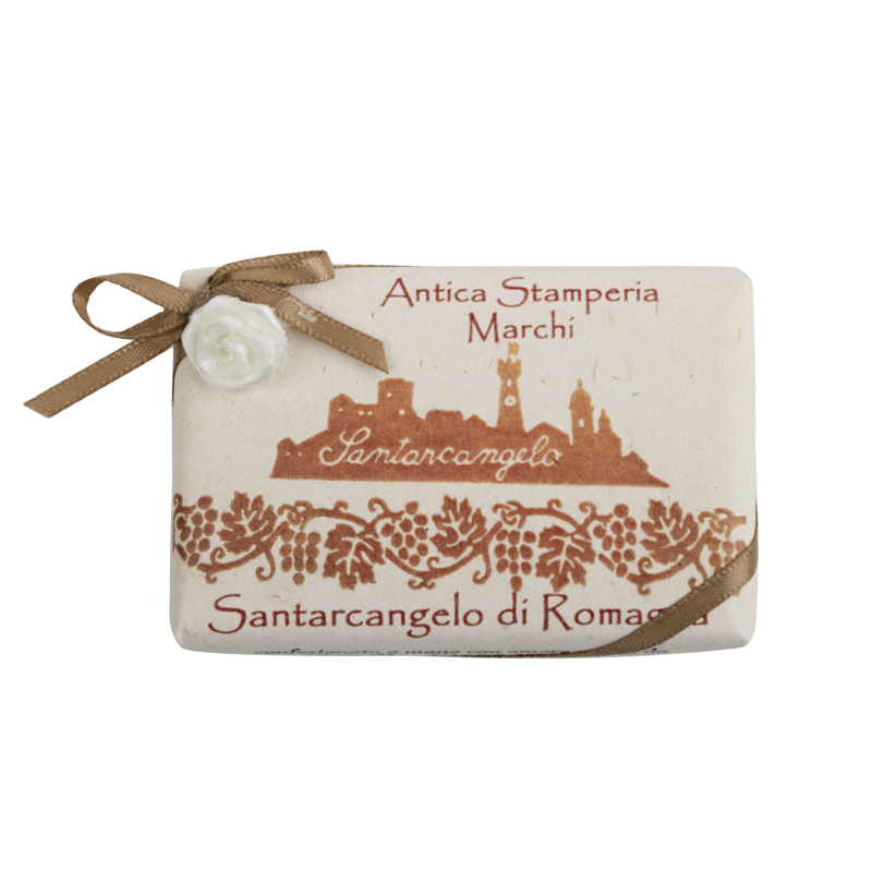 Saponetta con lo skyline di Santarcangelo e uva realizzata secondo l’antica tradizione manifatturiera, con materie prime di origine vegetale finemente profumati in trafila, solo con fragranze accuratamente selezionate.