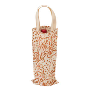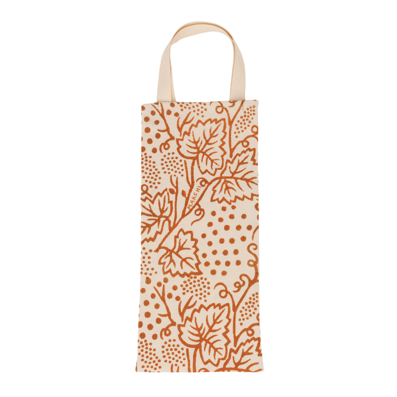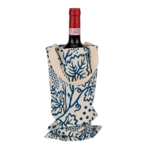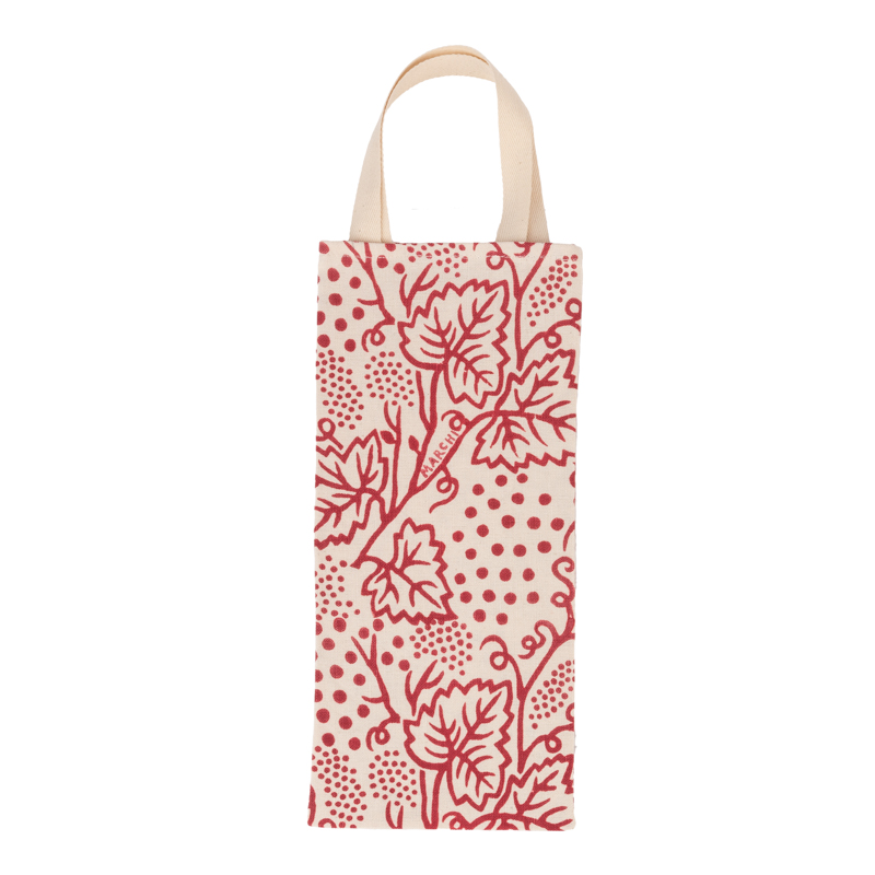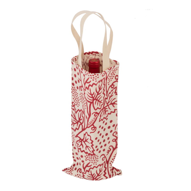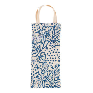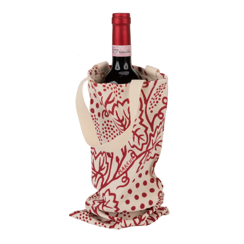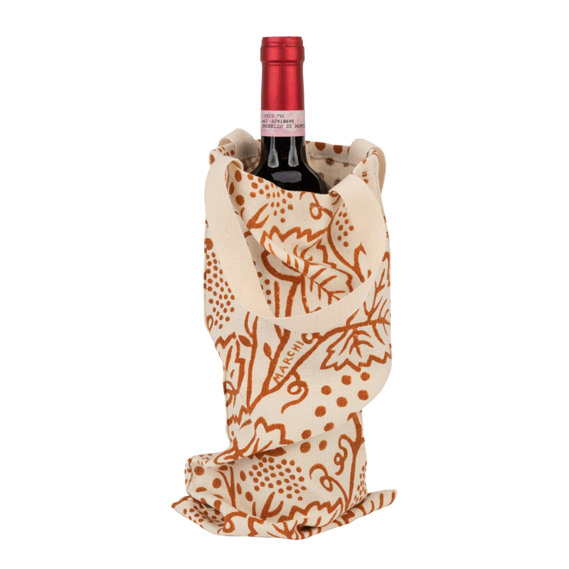 Shopper pensata per trasportare o regalare bottiglie di vino o di olio realizzata con tessuto di alta qualitร stirato con il nostro antico mangano del 1633 e sapientemente stampato a mano con il disegno del grappolo d’uva stilizzato.
