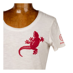 T-shirt donna in puro cotone biologico stampata a mano con il disegno del geco.