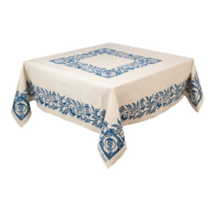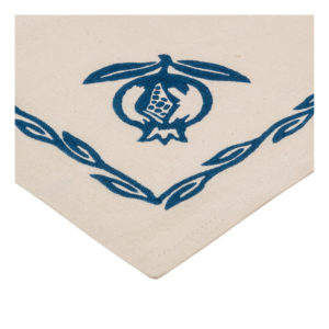 Tovaglia quadrata con i tovaglioli realizzata con tessuto stirato con il nostro antico mangano del 1633 e sapientemente stampato a mano con il disegno del melograno.