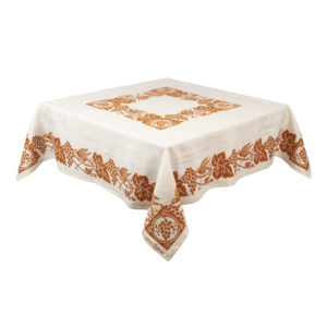 Tovaglia quadrata con i tovaglioli realizzata con tessuto stirato con il nostro antico mangano del 1633 e sapientemente stampato a mano con il disegno dell’uccellino che becca l’uva.