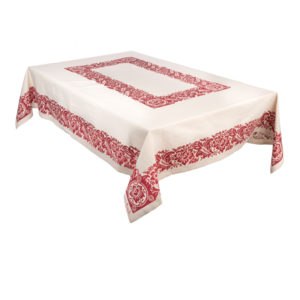 Tovaglia rettangolare senza tovaglioli realizzata con tessuto stirato con il nostro antico mangano del 1633 e sapientemente stampato a mano con il disegno del fiore.