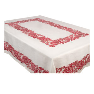 Tovaglia rettangolare 200×150 in puro lino con 6 tovaglioli realizzata con tessuto stirato con il nostro antico mangano del 1633 e sapientemente stampato a mano con il disegno della pigna.