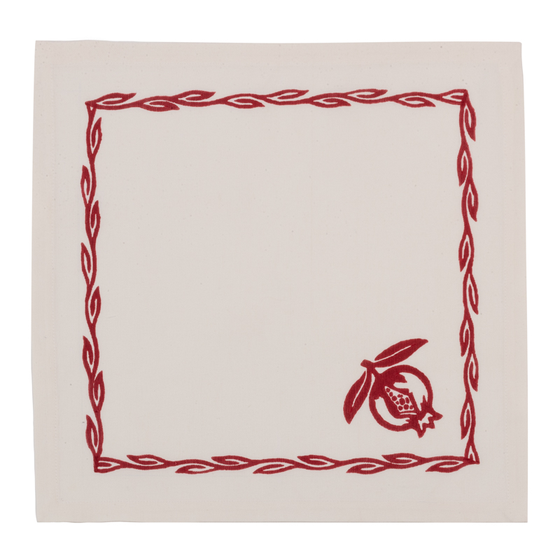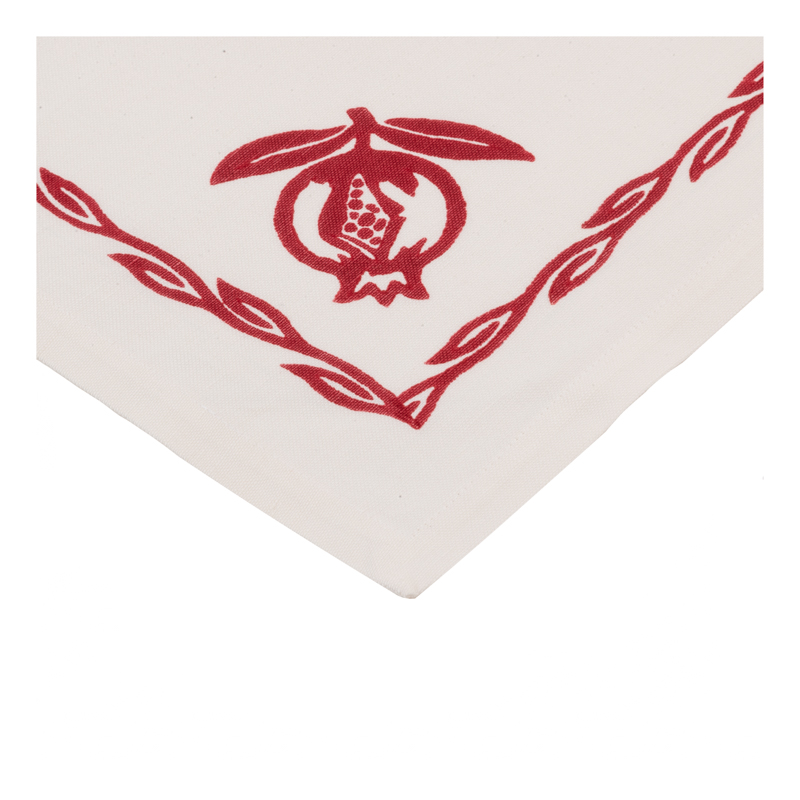 Tovaglia tonda in misto lino con i tovaglioli realizzata con tessuto stirato con il nostro antico mangano del 1633 e sapientemente stampato a mano con il disegno del melograno.