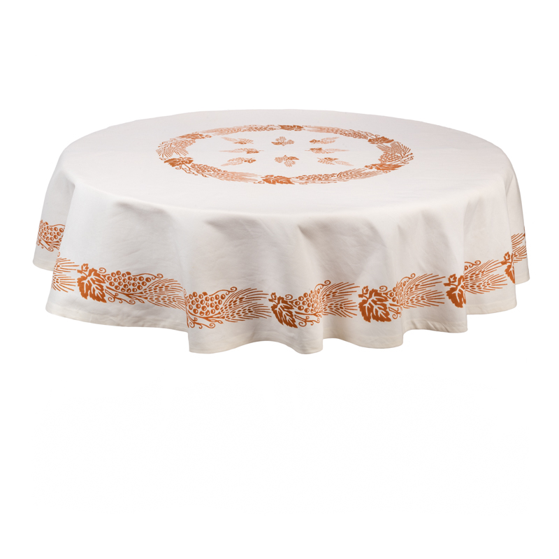 Tovaglia tonda in misto lino senza tovaglioli realizzata con tessuto stirato con il nostro antico mangano del 1633 e sapientemente stampato a mano con il disegno della spiga e uva.